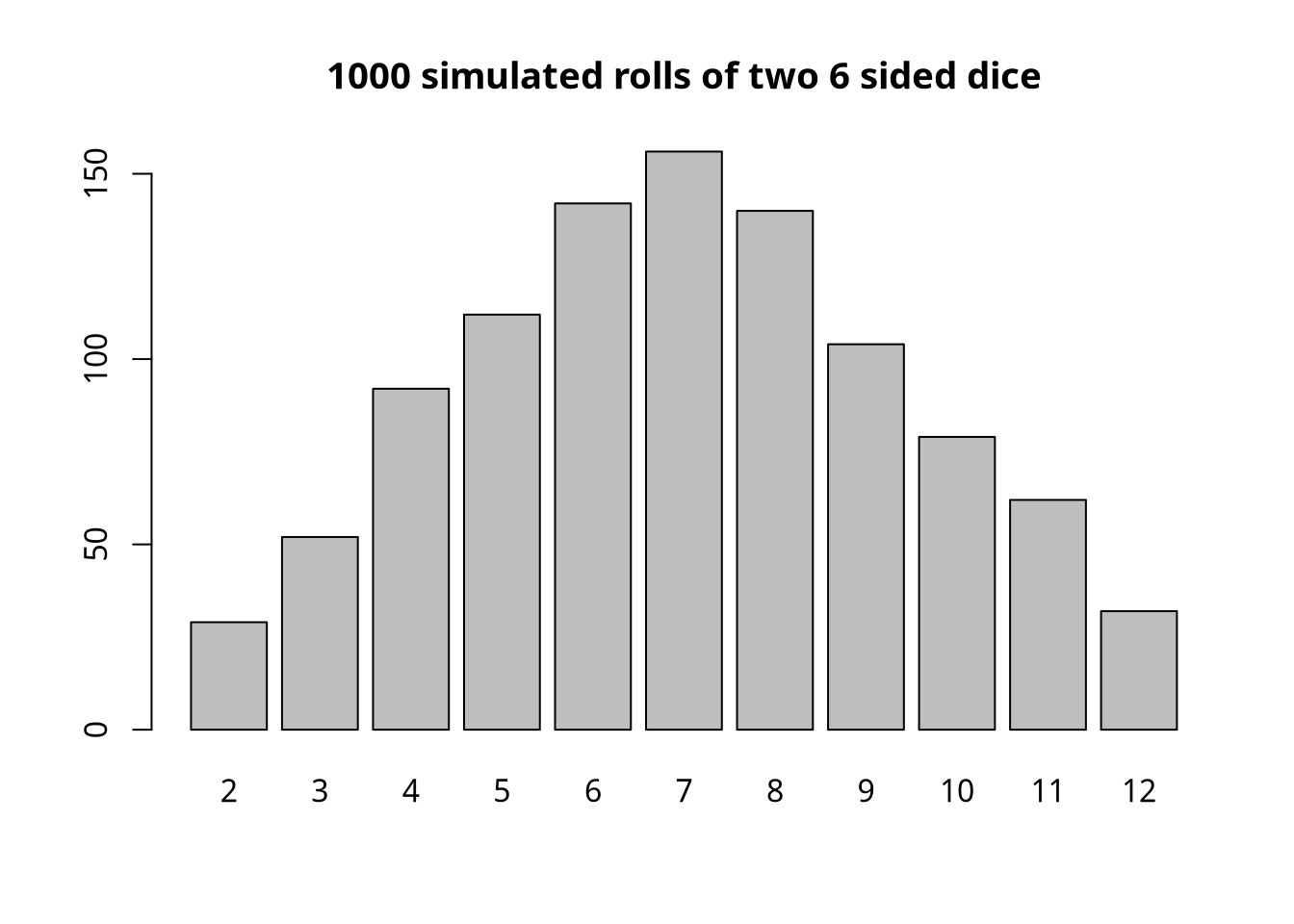 Recall from Activity 1 we made a bar graph of the results we get from rolling two 6 sided dice. As an example, simulating \(1000\) rolls, I generated the following bar graph.