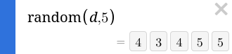 Having defined “d = binomialdist(n, p)” we can generate random numbers with this distribution using “random(d)” or if we want multiple, we can add a number like “random(d, 5).”